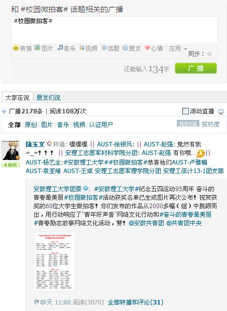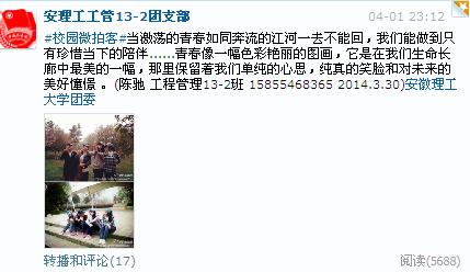 本次活动是学校获批团中央“学校共青团重点工作创新”试点项目后开展的专题活动之一,旨在纪念五四运动95周年,响应全团“青年好声音”网络文化行动和“奋斗的青春最美丽”青春励志故事网络文化活动,在广大青年学生中大力弘扬求知上进、文明友善、励志进取、乐于助人的校园正能量,通过网络新媒体实现对广大青年学生的组织动员、思想引领和成长服务。活动自3月25日启动之后,全校各级团学组织动员广大团员青年举起手机、相机加入到校园微拍客的队伍中,随时随地捕捉校园中细小却温暖的感人瞬间,累计在腾讯、新浪个人和共青团组织微博上发布作品2100多幅(组),话题页阅读总量超过108万,在网上、网下营造出了和谐向上、健康温暖的校园文化氛围。