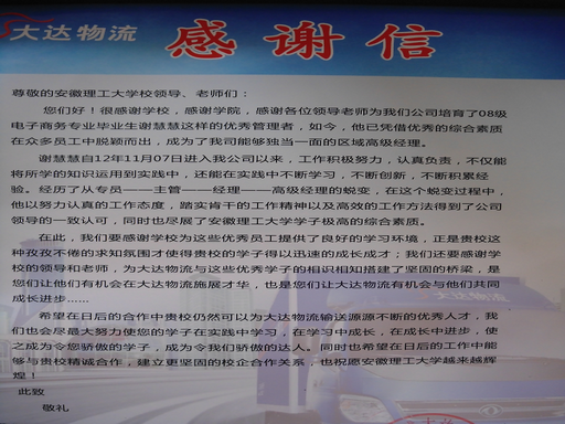 感谢信中写到:“很感谢学校,感谢学院,感谢各位领导老师为我们公司培养了08级电子商务专业毕业生谢慧慧这样的优秀管理者,如今,她已凭借优秀的综合素质在众多员工中脱颖而出,成为了我公司能够独挡一面的区域高级经理。谢慧慧自入职以来,工作积极努力,认真负责,不仅能将所学的知识运用到实践中,还能在实践中不断学习,不断创新,不断积累经验。她经历了从专员——主管——经理——高级经理的蜕变,在这个蜕变的过程中,她以努力认真的工作态度,踏实肯干的工作精神以及高效的工作方法得到了公司领导的一致认可,同时也尽展了博业体育(中国)官方网站-登录入口学子极高的综合素质。”