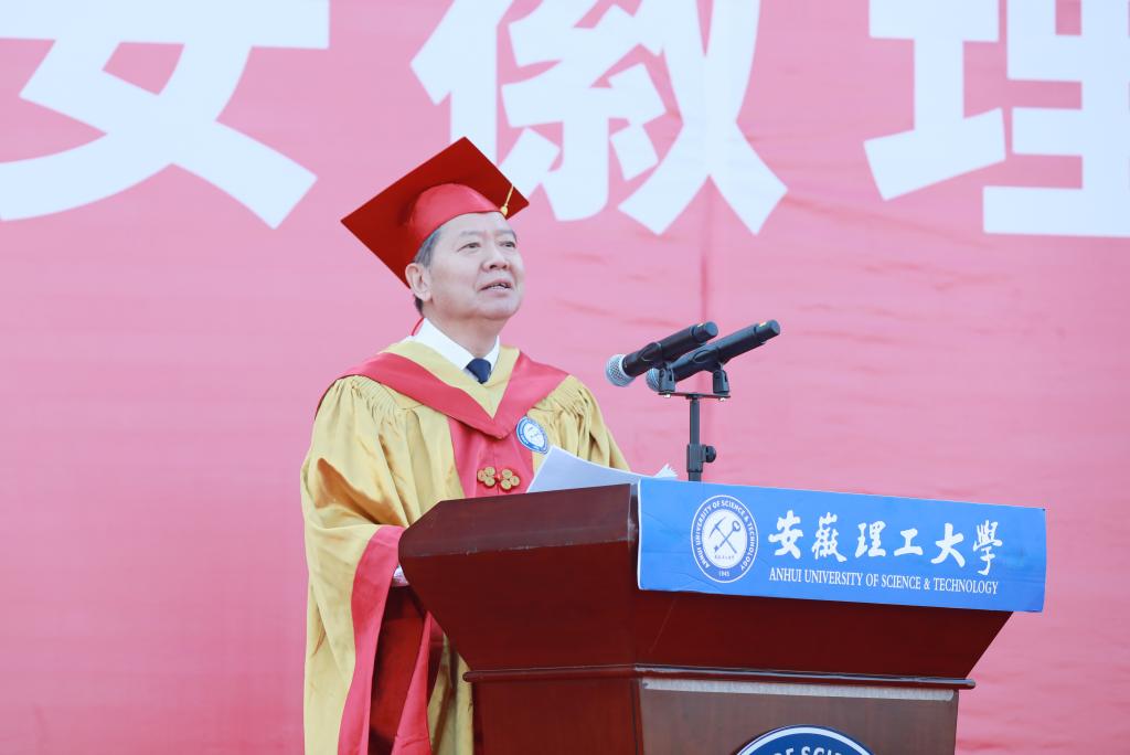 毕业生家长代表、霍邱县新店镇中心学校屠俊老师,教师代表、高等研究院(合肥)执行院长徐良骥教授,博士毕业生代表、安全工程专业余国锋同学,硕士毕业生代表、地质资源与地质工程专业顾焕琪同学,本科毕业生代表、资源循环科学与工程专业庄雨同学分别作了发言。