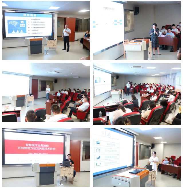 医院副院长谢应海、周淑萍分别围绕《建设数字化科研平台助力科研工作数字化转型》《安理大一附院互联网医院项目运营策略及数据分析》进行详细介绍。校电气与信息工程学院院长周孟然教授,人工智能学院院长王成军教授,材料科学与工程学院生物功能复合材料创新团队负责人潘育松教授,计算机科学与工程学院院长方贤进教授、苏树智副教授等分别围绕《数据归约技术用于矿工健康状况智能辨识研究》《下肢康复训练机器人》《医用植入材料表/界面功能化设计及生物适配性研究》《多模态医学影像分割融合方法研究》等进行讲课。此外,医院的王东明、王晓娟、金祝华分别围绕《医疗物联网场景下智慧药房应用》《智慧药学助力全流程用药管理》《“互联网+”时代智慧医院建设思考》进行深入探讨。校数学与大数据学院博士研究生毛古宝、计算机科学与工程学院硕士研究生李晓庆分别介绍了《智慧医疗行业业务流程可信管理方法及关键技术研究》和《电子病历信息抽取在构建临床决策辅助系统中的应用研究》。