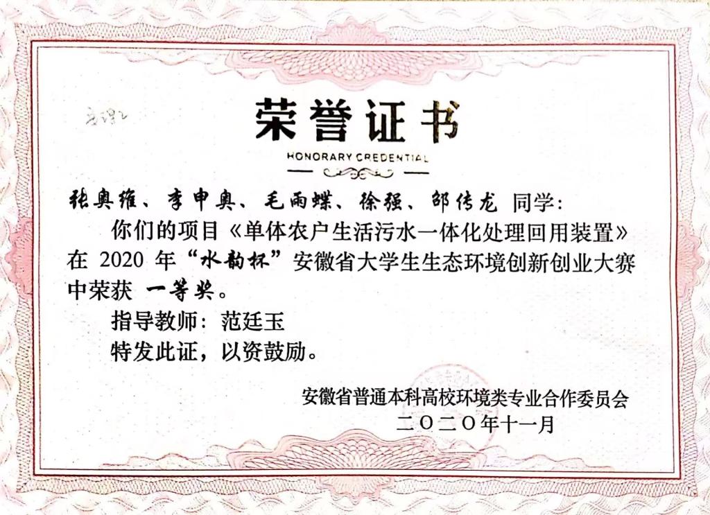2021年是我国脱贫攻坚取得全面胜利的一年。乡村污水治理是乡村振兴的重要组成部分。基于此,李申奥产生了做农村污水治理方面项目的想法,她想用自己的所学为乡村振兴的伟业贡献一份力量。全新的想法带来的是全新的开始,李申奥本人也戏称其为“筚路蓝缕启山林”。从检索大量的文献了解农村生活污水处理装置、工艺及进水参数,根据标准灵活设计组合工艺、发掘创新点,到最后完成项目报告书的撰写,李申奥及项目组付出了大量的心血,精雕细琢地打磨作品。然而,通往成功的道路往往是曲折的,在绘制装置平面图上,没有学习过CAD的成员们犯了难。一开始他们打算自学绘制软件,但是最后发现自学的他们赶不上截止日期。这时候,负责班级工程制图课程的老师李坤及时伸出援手。他联系到机械学院杨继冲同学,为小组解决了燃眉之急。紧接着,装置实物被定制出来。综述论文《农村生活污水的处理现状与前景》和实用新型专利“一种农村单户生活污水一体化处理装置”也陆续完成。
