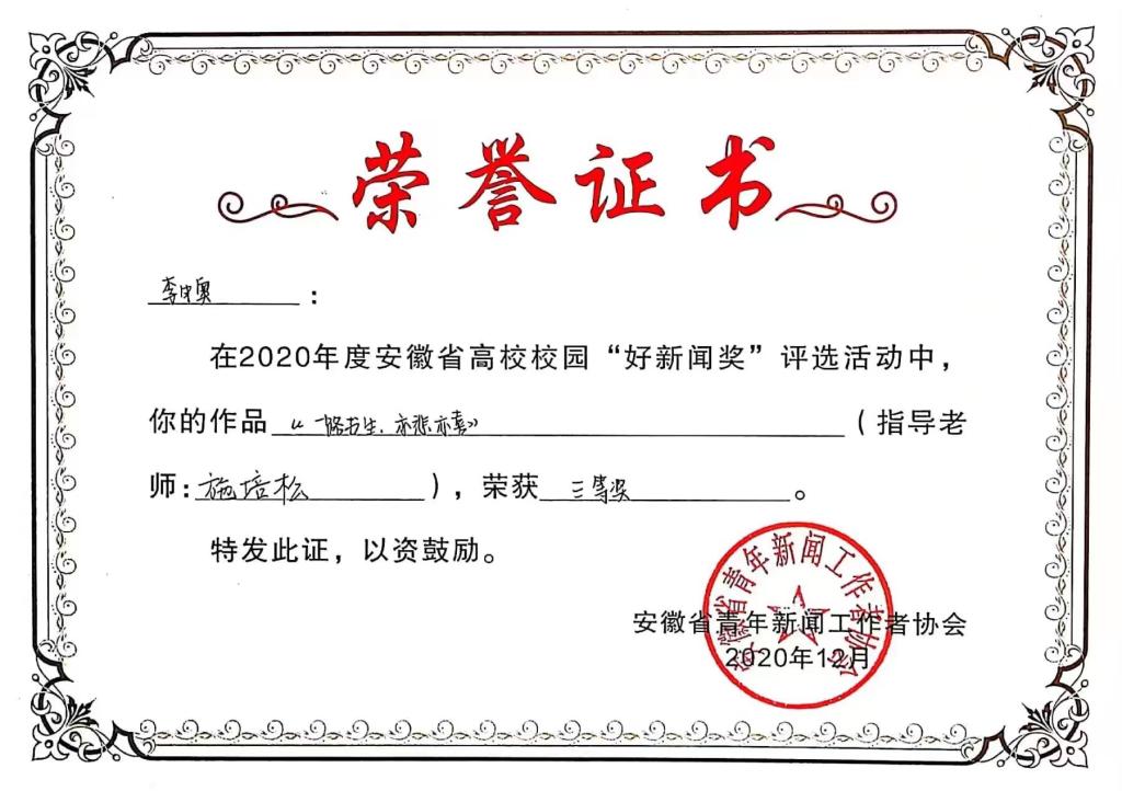 在进入大学后,身为理工科专业的她每天与文字打交道的机会很少,为了延续自己的热爱,李申奥加入了博业体育(中国)官方网站-登录入口记者团,这也是她大学期间加入的唯一一个学生组织,她将自己课余时间全部交给了记者团、交给了文字,对于她来说,记者团就是她第二个学习的地方。在大部分刚入团的新生将硬性要求的每月三篇才艺稿当作负担的时候,李申奥却十分感谢这个要求,因为才艺稿让她保持住了对文字的敏感。每个月,她都会非常认真的完成自己的才艺稿,从不敷衍了事,即使在大四的今天,她依然在电脑里保留着之前写过的每一篇文章。对于她来说,这些文字见证了她在大学里的心理路程与改变。而所有的努力都不会白费,她在大一国庆期间创作的一篇关于安理与祖国一同成长的文章登在了《博业体育(中国)官方网站-登录入口报》上,这是她第一篇登上报纸的文章。当看到自己的名字出现在报纸上时,李申奥既开心又兴奋,“我很重视自己的写作能力与文学素养,当我看到自己的文章登在报纸上的时候,我真的超级满足”,李申奥说。在记者团的三年里,李申奥在《博业体育(中国)官方网站-登录入口报》上发表文章共9篇,在学校公众号上发表推文6篇,她的作品《一路书生,亦悲亦喜》还在安徽省高校校园好新闻大赛中获得三等奖。笔尖下的文字,是李申奥成长路上开出的最独特的一朵玫瑰,也是她在大学生活中与自己独处的机会。