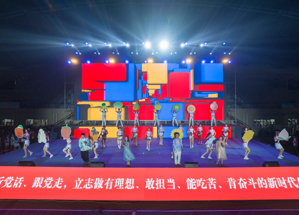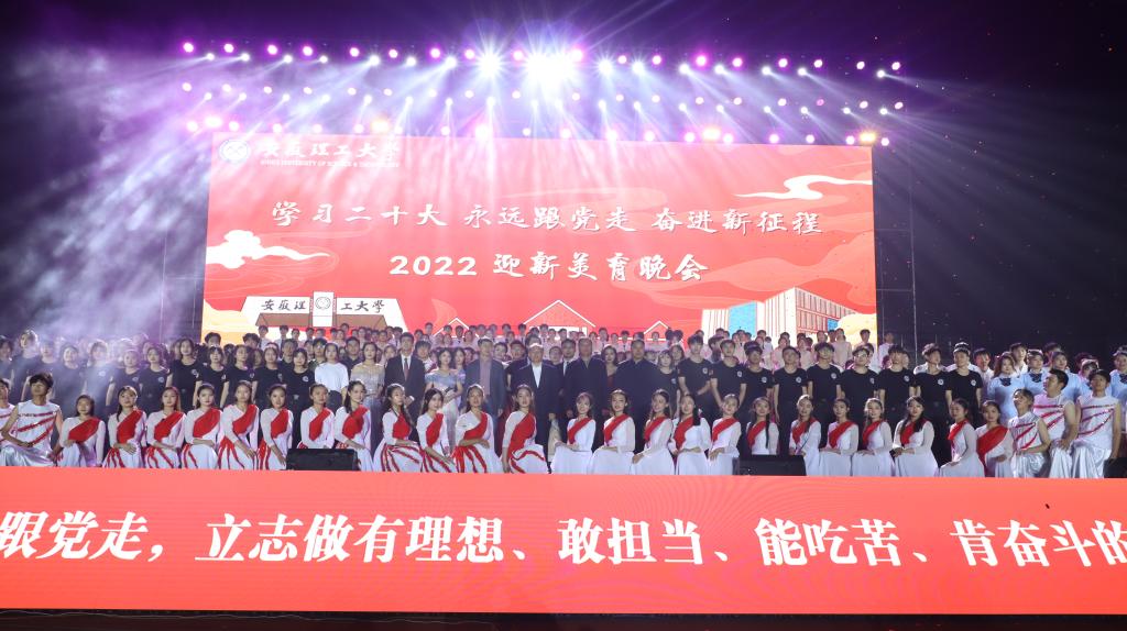 晚会聚焦党的十八大以来我国经济社会发展所取得的各项突出成就,围绕经济、政治、文化、社会和生态文明建设“五位一体”总体布局,以歌曲、舞蹈、器乐、情景剧等形式展现出一台精彩绝伦的艺术盛会与思政课堂。歌舞《时代感》开场燃动现场,青春的舞姿伴随着动感的旋律唱出了新时代新风范,舞出了新时代你我他;现代舞《星火永相传》以时空交错的表现形式将一代代航天科技工作者立志科技报国的感人故事搬上舞台,表达安理学子奋斗朝夕逐梦行、矢志投身国家重大工程的精神;歌舞情景表演《达拉崩吧(安理版)》是为2022级新同学量身定制的节目,歌手全新改编了歌词向全体新同学们“种草”校园里的美食美景和生活学习的经验,引起现场同学的强烈共鸣;2022级新生辅导员与新生合唱的歌曲《孤勇者》则掀起了全场热潮,新同学们勇敢表达青春的无畏与担当,现场万名同学齐声合唱,呼唤出开启大学征程的全新梦想;故事讲述《燃烧的雪花》由我校土木建筑学院宋恩周同学以北京冬奥会志愿者的身份分享了冬奥志愿者的点滴故事,诉说新时代中国青年胸怀天下的勇毅与决心、服务社会的奉献与担当;器乐演奏《山川和韵》以春夏秋冬四个季节为序,融合包含古人智慧的文化精髓“二十四节气”为切入,演奏出人与自然和谐共生的生态之美,大美中国青山绿水的锦绣画卷。“伟大的中国共产党,乘风破浪,扬帆远航,领航中国在新时代的征程上!”洪亮坚定的歌声气势磅礴、经久不息,晚会在歌舞《领航》中落下帷幕,全体师生起立,挥动着手中鲜红的党旗高声歌唱,唱出内心坚定不移听党话、跟党走,立志做有理想、敢担当、能吃苦、肯奋斗的新时代好青年的信念与决心!