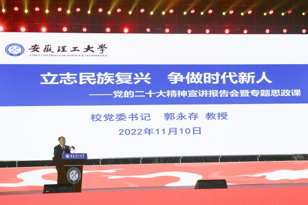 11月10日晚,在学校“学习二十大 永远跟党走 奋进新征程”2022迎新美育晚会现场,校党委书记郭永存为2022级全体新生上专题思政课,宣讲党的二十大精神。
