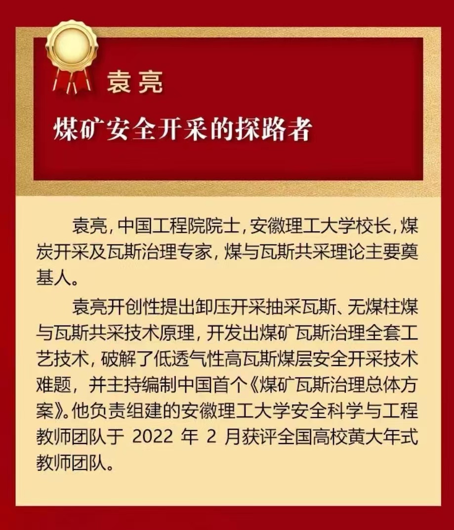 2022年12月31日,由安徽日报社主办的2022年度安徽“十大新闻”“十大新闻人物”评选揭晓,校长袁亮院士入选2022年度安徽“十大新闻人物”。
