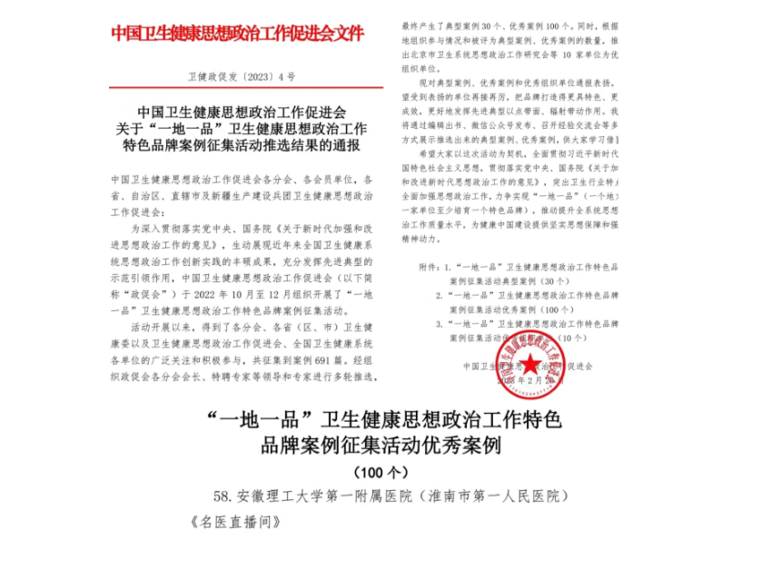 为推动提升全系统思想政治工作质量水平,为健康中国建设提供坚实思想保障和强大精神动力,近日,中国卫生健康思想政治工作促进会对多个典型案例、优秀案例和优秀组织单位通报表扬,学校一附院党委宣传处报送的健康科普品牌节目《名医直播间》荣获“一地一品”卫生健康思想政治工作特色品牌案例征集活动优秀案例!