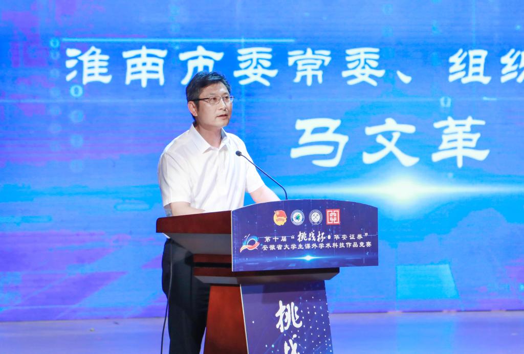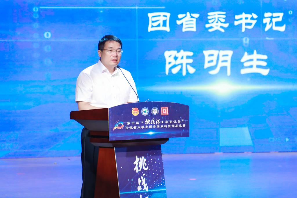 陈明生致辞。他代表共青团安徽省委、省学联,向在本次大赛中取得优异成绩的学校、团队和个人表示祝贺!向为大赛付出辛勤努力的学校领导、师生,向支持本次大赛的淮南市委市政府、华安证券股份有限公司表示感谢!他指出,党的十八大以来,以习近平同志为核心的党中央高度重视科技创新,把创新摆在国家发展全局的核心位置,特别是习近平总书记对安徽下好创新先手棋、推动创新驱动发展,多次作出重要指示、提出明确要求。团省委按照省委省政府的部署要求,立足经济社会发展和青年成长成才规律,深入打造“永不落幕的挑战杯”。已连续举办十届的“挑战杯”,已成为激发全省青年学子彰显创新活力的重要品牌,孵化科创人才与成果的有效载体!陈明生提出三点希望:一是青年学子坚定理想信念,练就过硬本领,做引领创新创业的“追梦人”和“奋斗者”;二是全省各级团组织凝聚青年智慧,激发青年力量,做青年创新创业的“引路人”和“守护者”;三是社会各界共同汇聚合力,共筑良好生态,做青年成长成才的“知心人”和“护航者”。他表示,党的二十大擘画了以中国式现代化全面推进中华民族伟大复兴的宏伟蓝图,目标催人奋进,奋斗正当其时!希望广大青年学子自觉以强国建设为己任、以强皖兴皖为追求,勇于担当、奋发有为,高擎“挑战杯”火炬,吹响科技创新的“青春”号角,为现代化美好安徽建设贡献青春智慧和力量!
