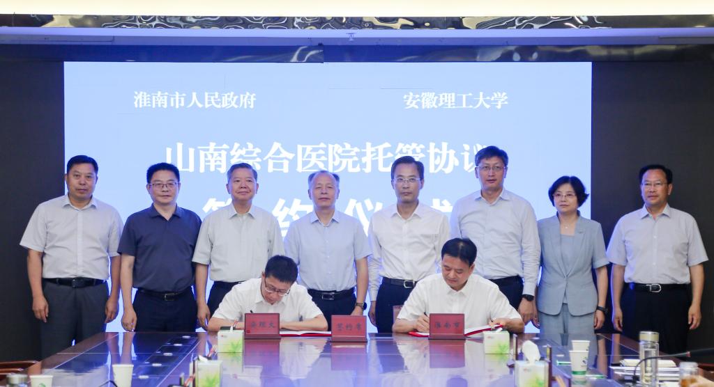 期间,市校举行了淮南市山南综合医院项目委托运营管理协议签约仪式,张志强、郭永存、袁亮、孙良鸿、陆晞、戴宜斌、余玉刚、鲁超等市校领导共同见证签约。