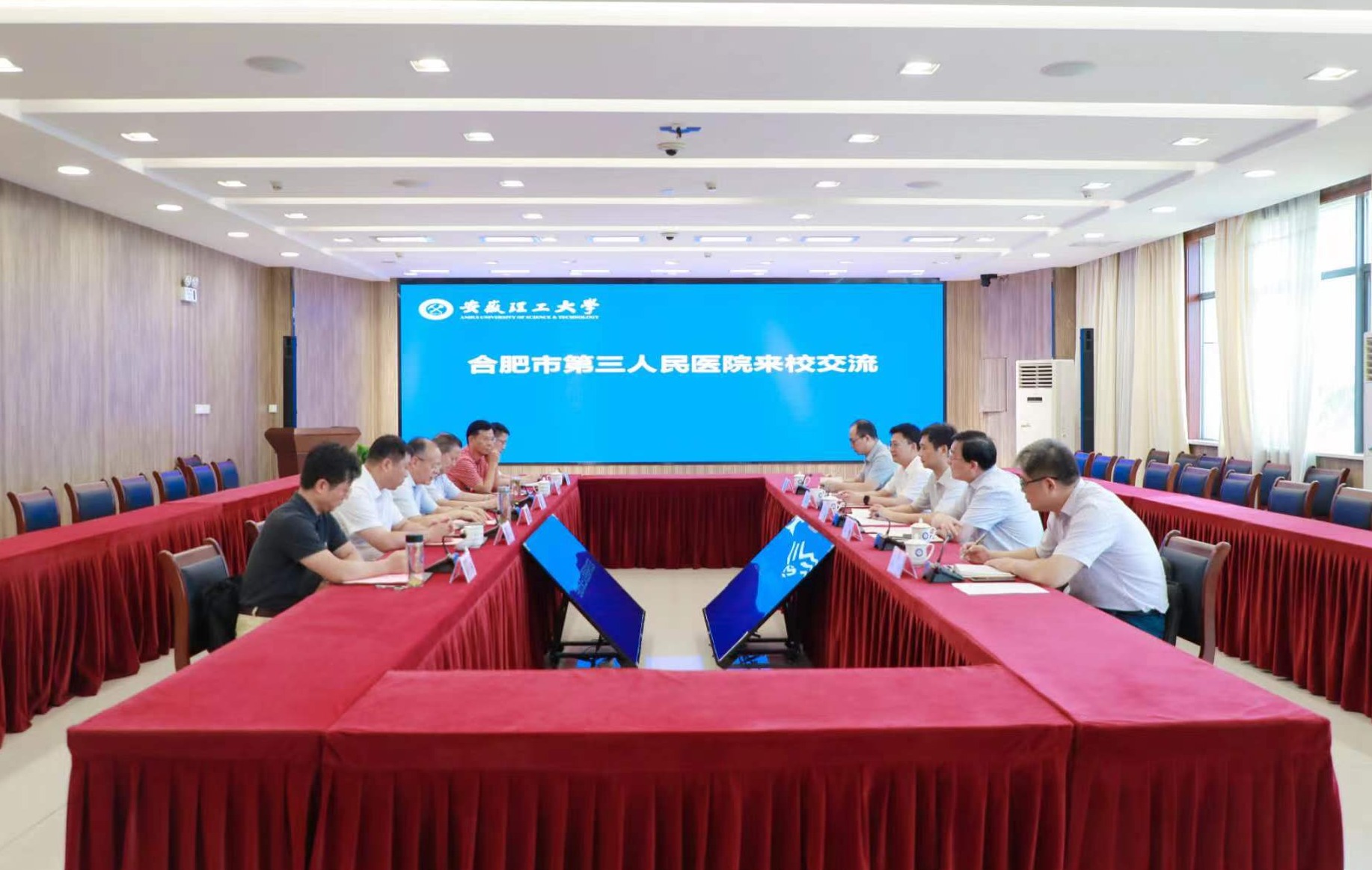9月6日下午,合肥市卫健委党委副书记、副主任王瑞率领合肥市第三人民医院党委书记阚明,党委副书记、院长章尚乐,党委委员、副院长沈泌等一行来校洽谈合作。校党委书记郭永存,校党委副书记、校长袁亮院士会见来宾,双方在舜耕苑二楼会议室举行座谈交流会。校党委常委、副校长鲁超出席座谈交流。