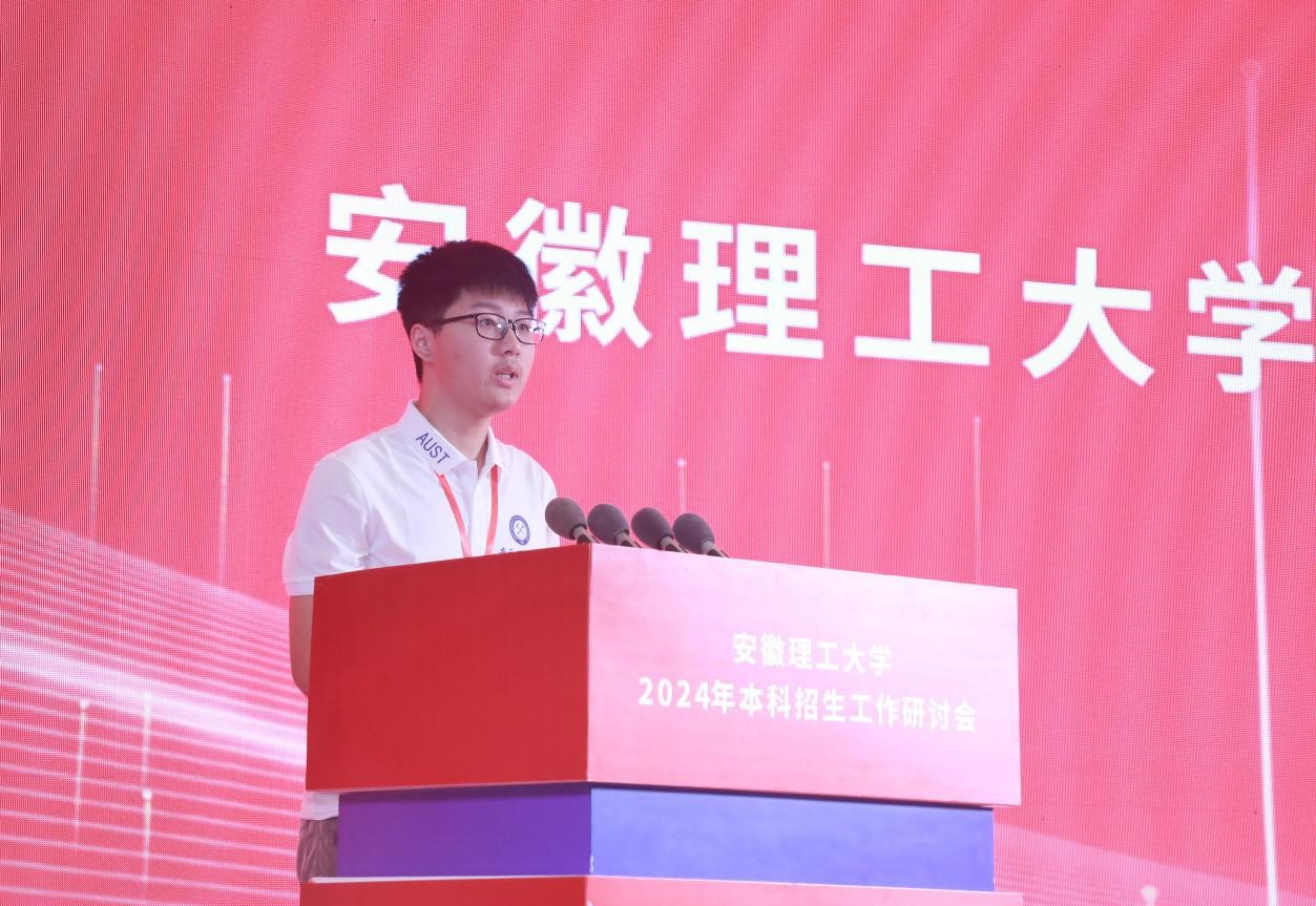 2024年录取新生代表、马鞍山市含山中学周子涵发言。“十年寒窗苦读,终以步入安理完美收官” ,他分享了成为“安理人”的喜悦与光荣,表达了对中学母校的感恩之情和对即将开启的大学生活的无限憧憬与期待,表示将刻苦学习,争当先进,用汗水和努力书写在安理的青春华章,相信在淮南这片充满希望的沃土上定能开出绚烂多彩的青春花朵。