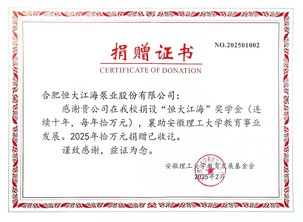 近日,学校教育发展基金会收到合肥恒大江海泵业股份有限公司捐赠的10万元人民币。这是恒大江海泵业向我校捐赠的“恒大江海”奖学金第一笔到账。