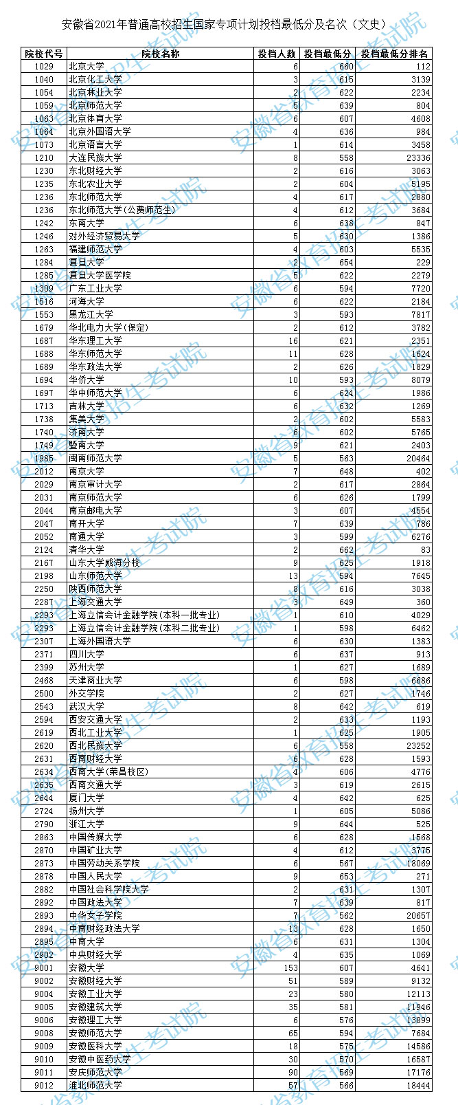 安徽省2021年普通高校招生国家专项计划投档最低分及名次(文史)